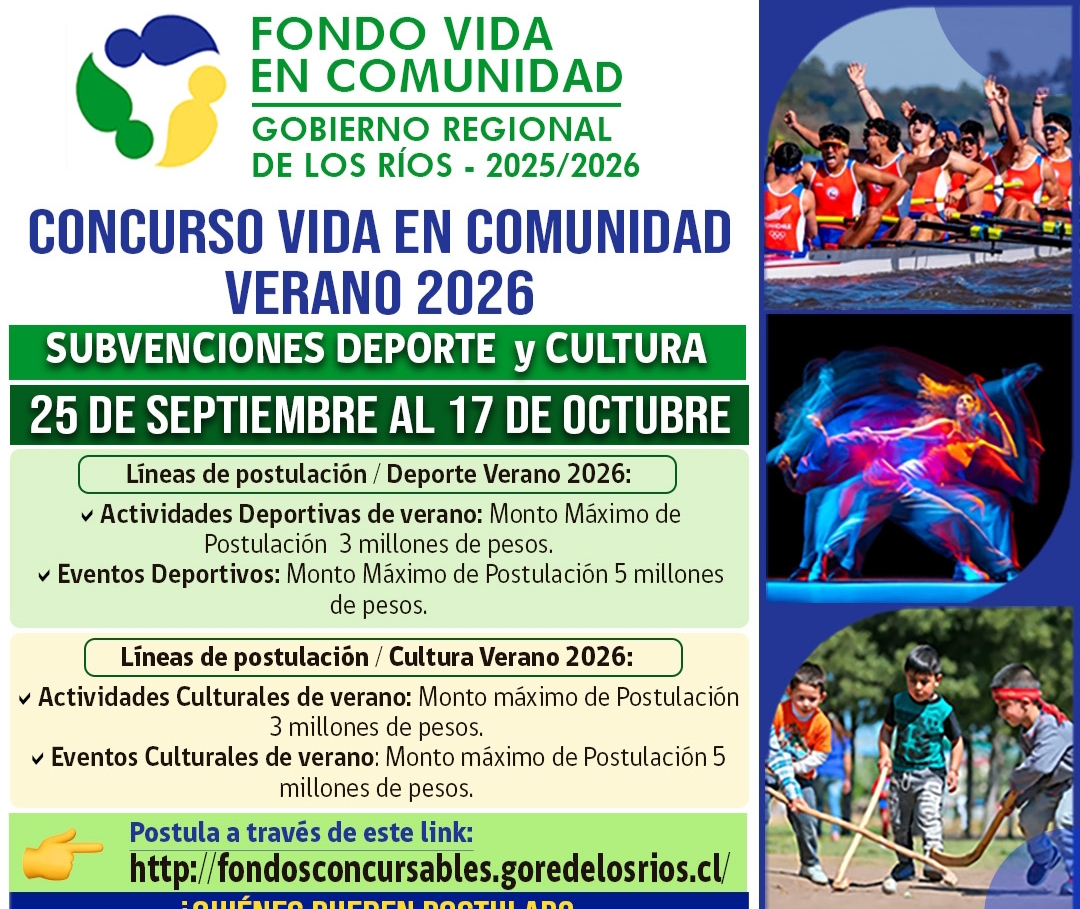 El Gobierno Regional de Los Ríos anunció la apertura del Concurso Vida en Comunidad Verano 2026, que este año considera una inversión total de 416 millones de pesos con cargo a la subvención del 8% del Presupuesto de Inversión Regional del Gobierno Regional de Los Ríos. La convocatoria se encontrará disponible para postulación desde el 25 de septiembre hasta el 17 de octubre, a través del portal institucional www.goredelosrios.cl.